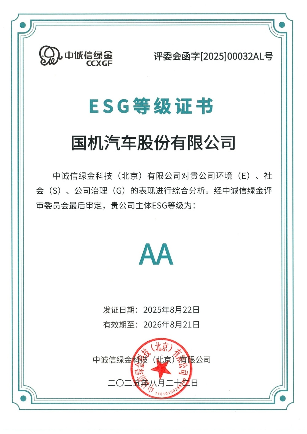 中诚信绿金是中国领先的ESG评级机构,构建了一套深度融合本土实践与国际规范的评级体系,其将AA评级的公司定义为“企业ESG综合表现优秀,ESG治理水平很高,ESG风险很低”。yl6809永利皇宫扎实贯彻国资央企新时代新使命新要求,深度融入汽车产业链发展,持续完善治理结构、践行环境责任,ESG评级逐年提升。